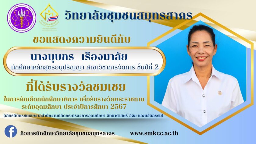 นางบุษกร เรืองมาลัย นักศึกษาวิทยาลัยชุมชนสมุทรสาคร หลักสูตรอนุปริญญา สาขาวิชาการจัดการ ชั้นปีที่ 2 ได้รับรางวัลชมเชย ในการคัดเลือกนักศึกษาพิการ เพื่อรับรางวัลพระราชทาน ระดับอุดมศึกษา ประจำปีการศึกษา 2567 (เกียรติบัตรชมเชยจากสำนักงานปลัดกระทรวงการอุดมศึกษา วิทยาศาสตร์ วิจัย และนวัตกรรม)