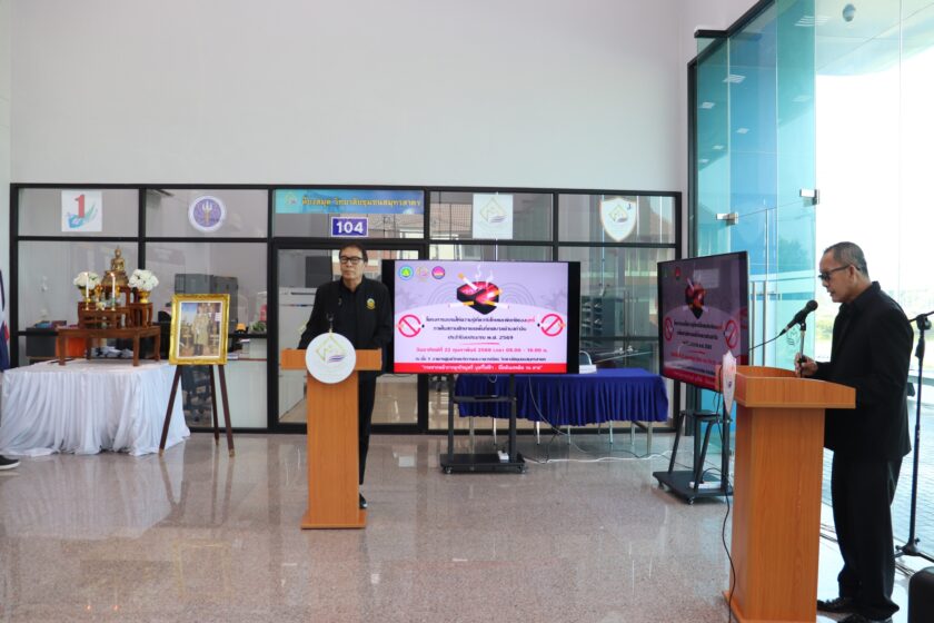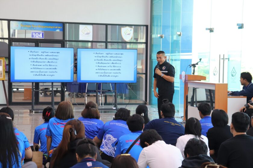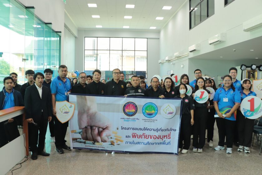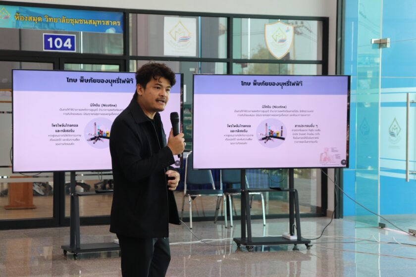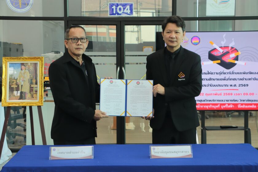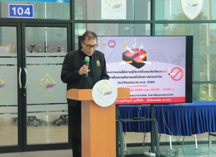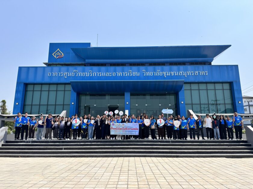 วันอาทิตย์ที่ 22 กุมภาพันธ์ 2569 กลุ่มงานกิจการนักศึกษา วิทยาลัยชุมชนสมุทรสาคร ร่วมกับเทศบาลตำบลท่าจีน นำแกนนำนักศึกษาวิทยาลัยชุมชนสมุทรสาคร จำนวน 120 คน จัดโครงการอบรมให้ความรู้เกี่ยวกับโทษและพิษภัยของบุหรี่ภายในสถานศึกษา เขตพื้นที่เทศบาลตำบลท่าจีน ประจำปีงบประมาณ พ.ศ. 2569