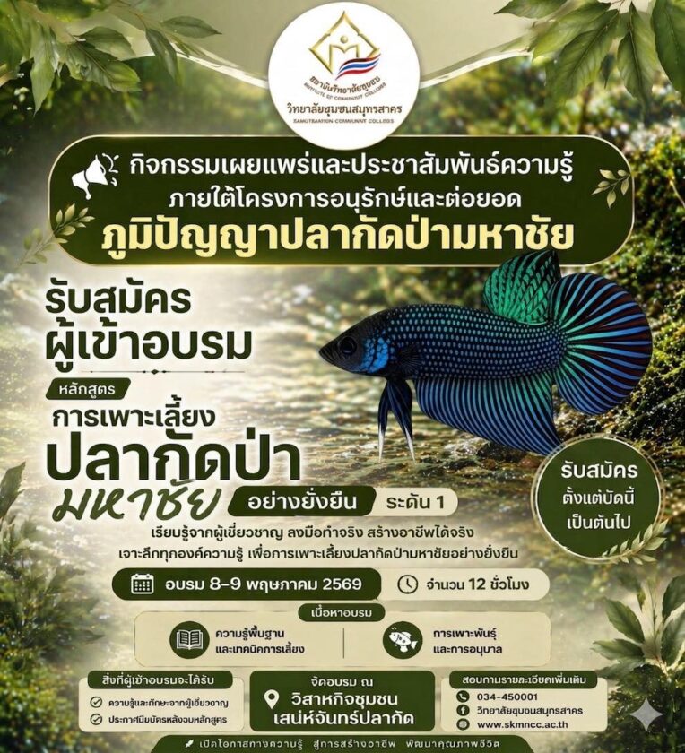 วิทยาลัยชุมชนสมุทรสาคร จัดกิจกรรมเผยแพร่และประชาสัมพันธ์ความรู้ ภายใต้โครงการอนุรักษ์และต่อยอด “ภูมิปัญญาปลากัดป่ามหาชัย” เปิดรับสมัครผู้สนใจเข้าร่วมอบรมหลักสูตร “การเพาะเลี้ยงปลากัดป่ามหาชัยอย่างยั่งยืน ระดับ 1” เพื่อส่งเสริมองค์ความรู้ด้านการเพาะเลี้ยงและต่อยอดสู่การสร้างอาชีพอย่างเป็นรูปธรรม