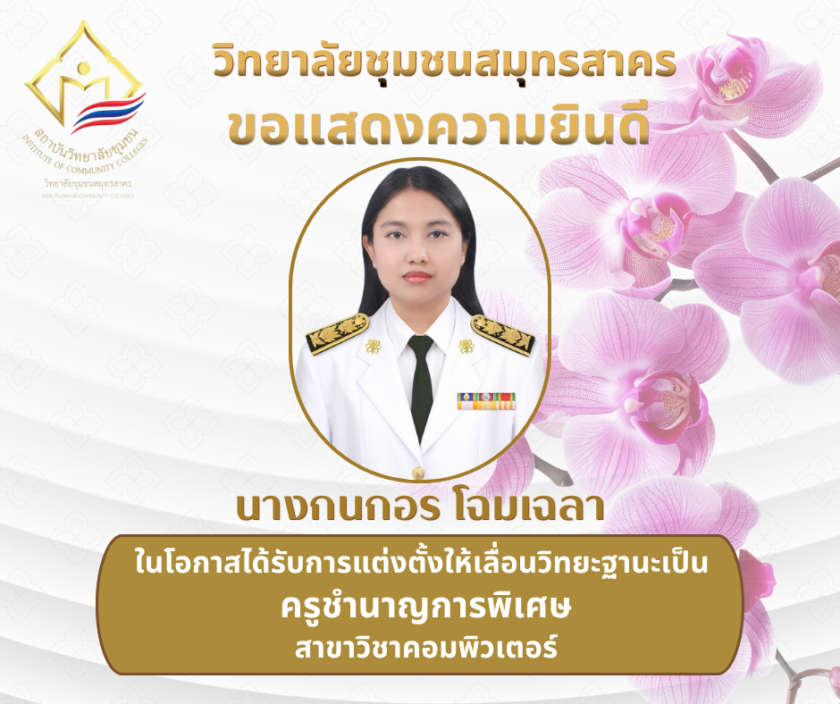 วิทยาลัยชุมชนสมุทรสาคร ขอแสดงความยินดีกับ นางกนกอร โฉมเฉลา เนื่องในโอกาสได้รับการแต่งตั้งให้เลื่อนวิทยฐานะเป็น ครูชำนาญการพิเศษ สาขาวิชาคอมพิวเตอร์